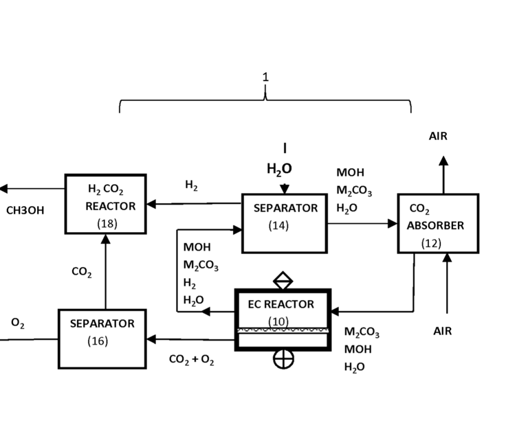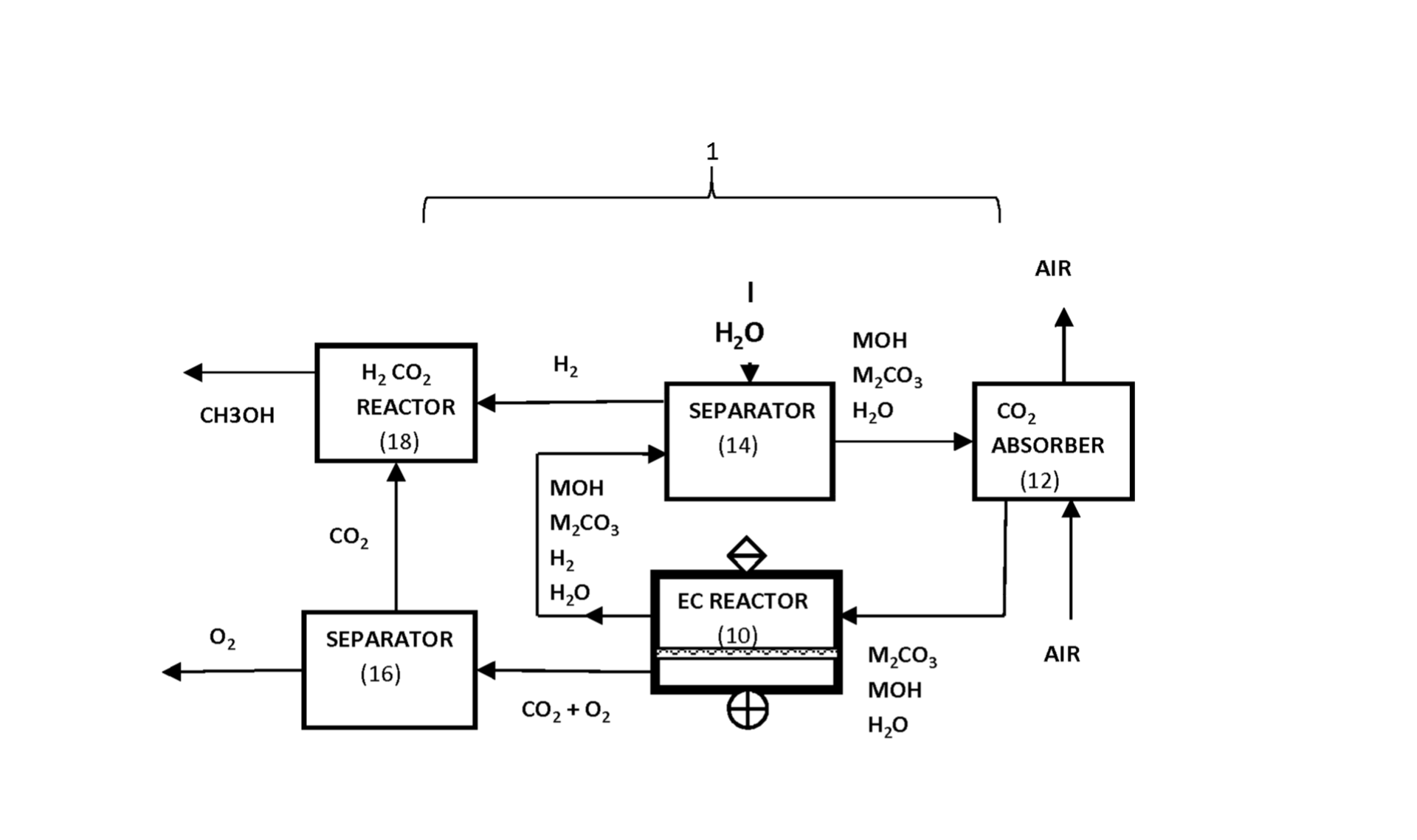 This system provides an efficient way to recycle key materials—hydroxide and carbon dioxide—from a chemical called alkali metal carbonate using an electrochemical reactor instead of a conventional heat-based process. The reactor separates these components through an electrochemical process: