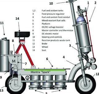 Mixed-reactant fuel cells (MRFCs) are a type of energy technology that combines fuel and oxygen in a single system to generate electricity. While this mix is thermodynamically unstable, this patent has developed a way to make it work for practical applications. In this study, a mixture of potassium formate solution (a liquid fuel) and oxygen (a gas) was used in an MRFC to power a small electric scooter for 15 minutes with a top speed of 10 km/h.